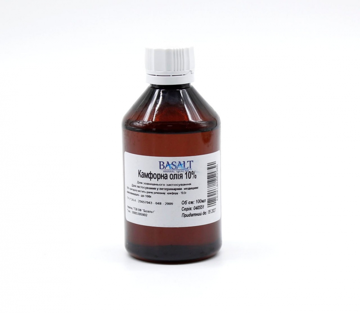 Маслянистая жидкость, прозрачная, желтоватого цвета со специфическим запахом камфоры. Препарат содержит действующее камфорное вещество. Назначают домашним и сельскохозяйственным животным для лечения артритов, бурсита, миозита и ревматического воспаления мышц. Рекомендуется как антисептическое, противовоспалительное, антимикробное средство при маститах. Препарат применяют наружно, после гигиенической обработки пораженного участка тела путем наложения аппликаций или втирания 1-2 раза в сутки на пораженный участок до выздоровления. Препарат не применяют животным перед убоем, а также кормящим животным, так как молоко может набирать запах камфоры. Предостережение: Препарат несовместим с хлоралгидратом, фенолом и ментолом. Молодые животные более чувствительны к камфоре, чем взрослые.