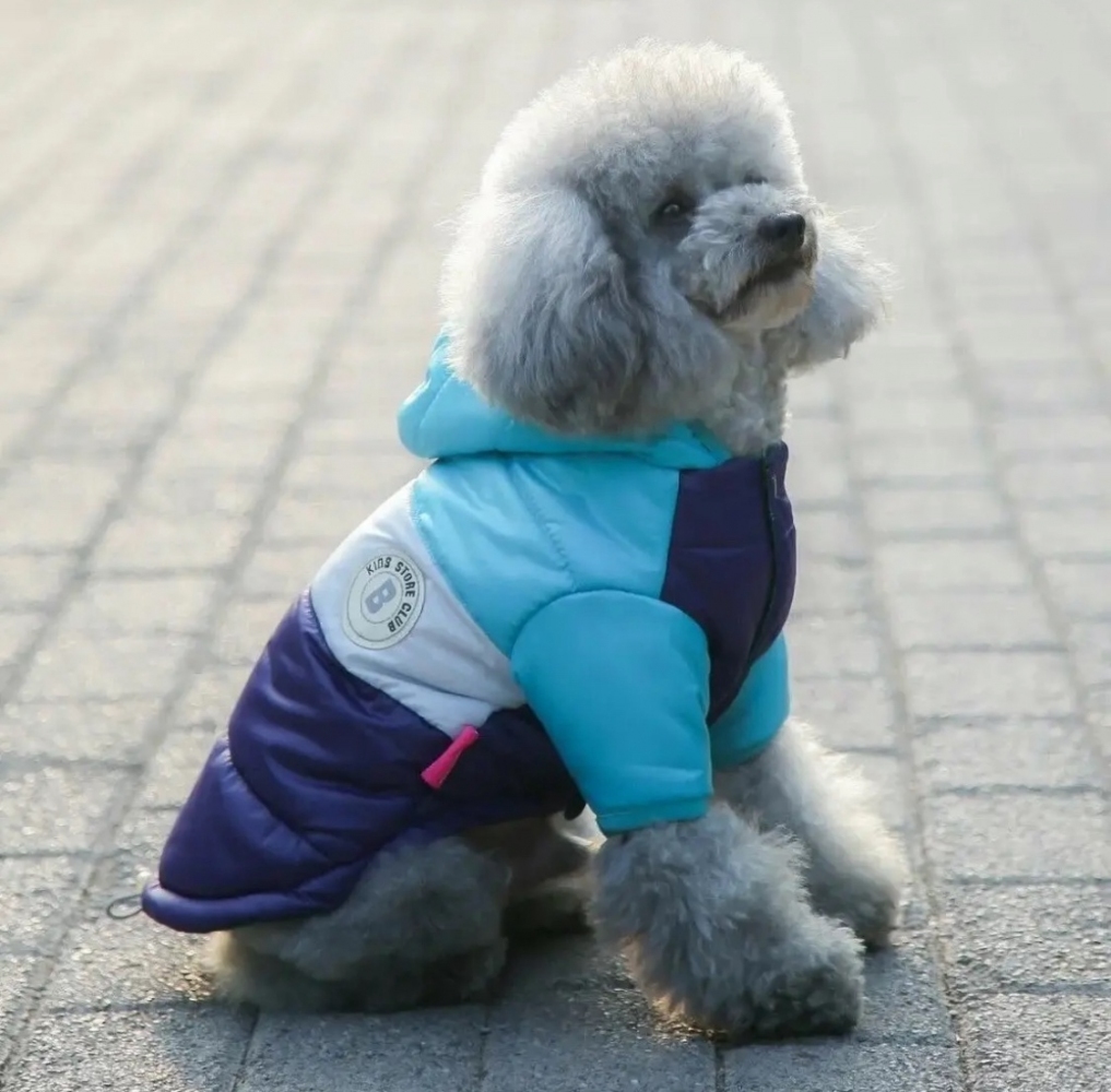 Стильная трехцветная куртка с современным дизайном, внутри утепленная синтепоном, на гладкой подкладке, застегивается на кнопки на животе, с капюшоном, отверстие для крепления поводка, на спине утяжка для регулировки талии. Для лучшей посадки по фигуре предусмотрена дополнительная кнопка на животе – можно застегнуть свободнее или плотнее.