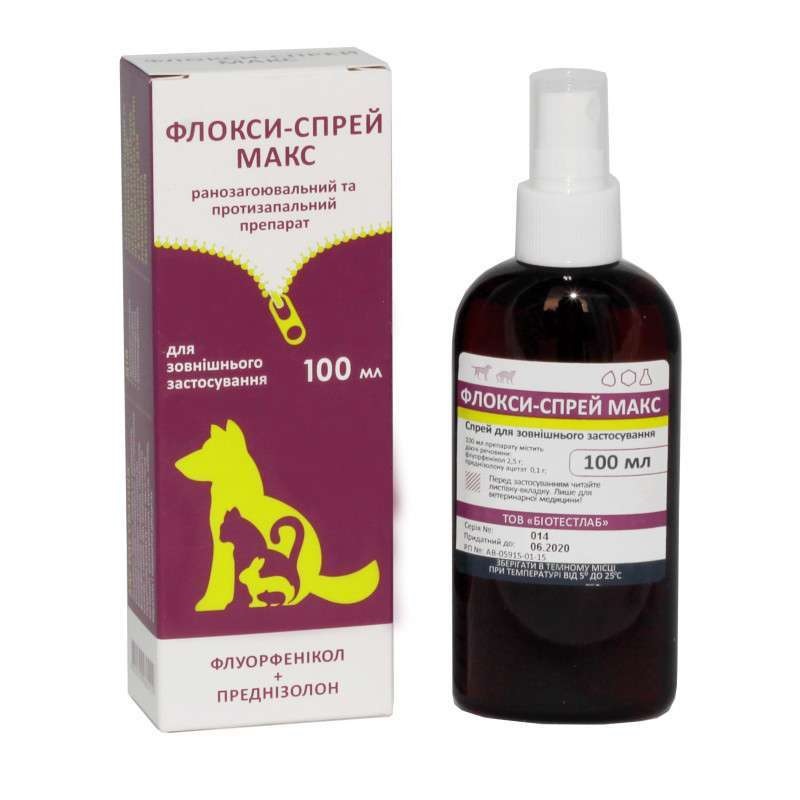 Флокси спрей Макс являет собой прозрачную жидкость бесцветную или светло желтого цвета. Обладает противомикробными, противовоспалительными, противоаллергическими и ранозаживляющими свойствами. Применяют для местного лечения дерматитов, экзем, панариций, при укусах, язвах, открытых абсцессах, а также травматических и хирургических ранах(после кастрации).