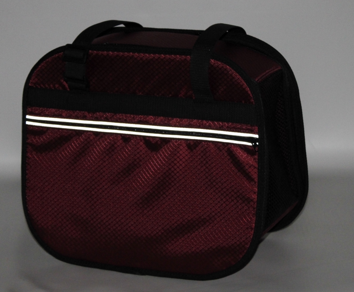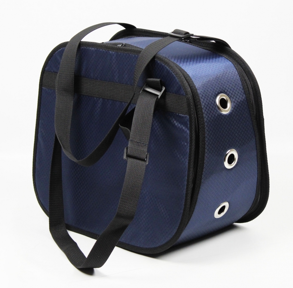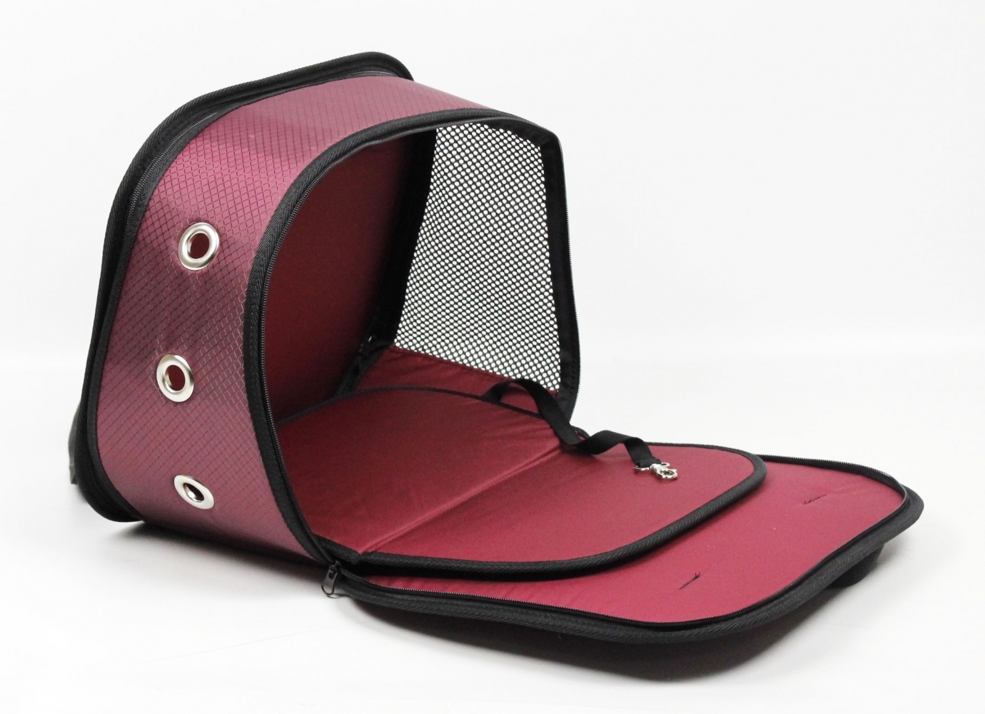 Раскладная дорожная сумка изготовлена из плотной водоотталкивающей плащевки в узор, наполнитель войлок. Карман спереди на молнии, по бокам отверстия для циркуляции воздуха, сбоку есть воздухопроницаемая сетка, поводок с карабином для фиксации за ошейник.