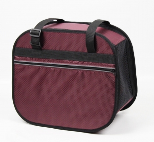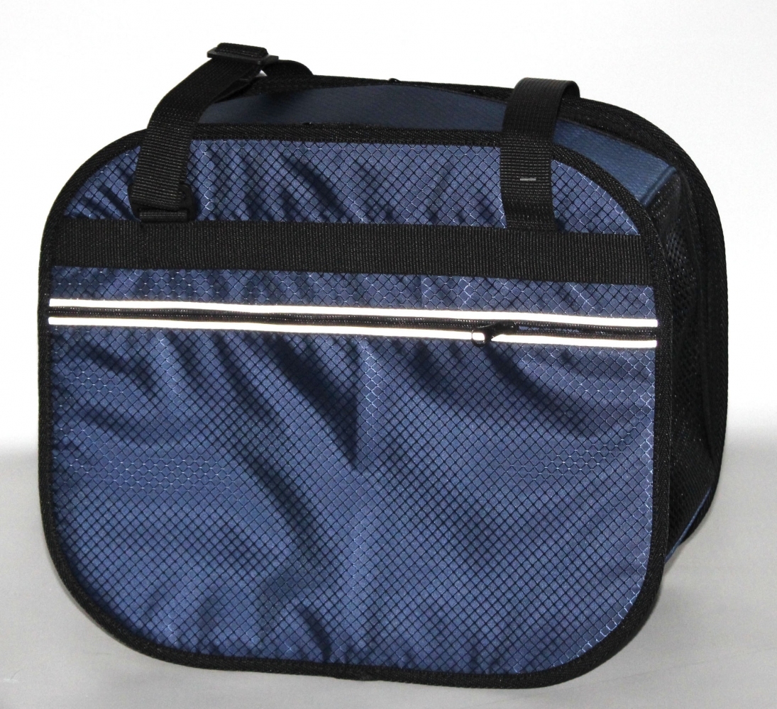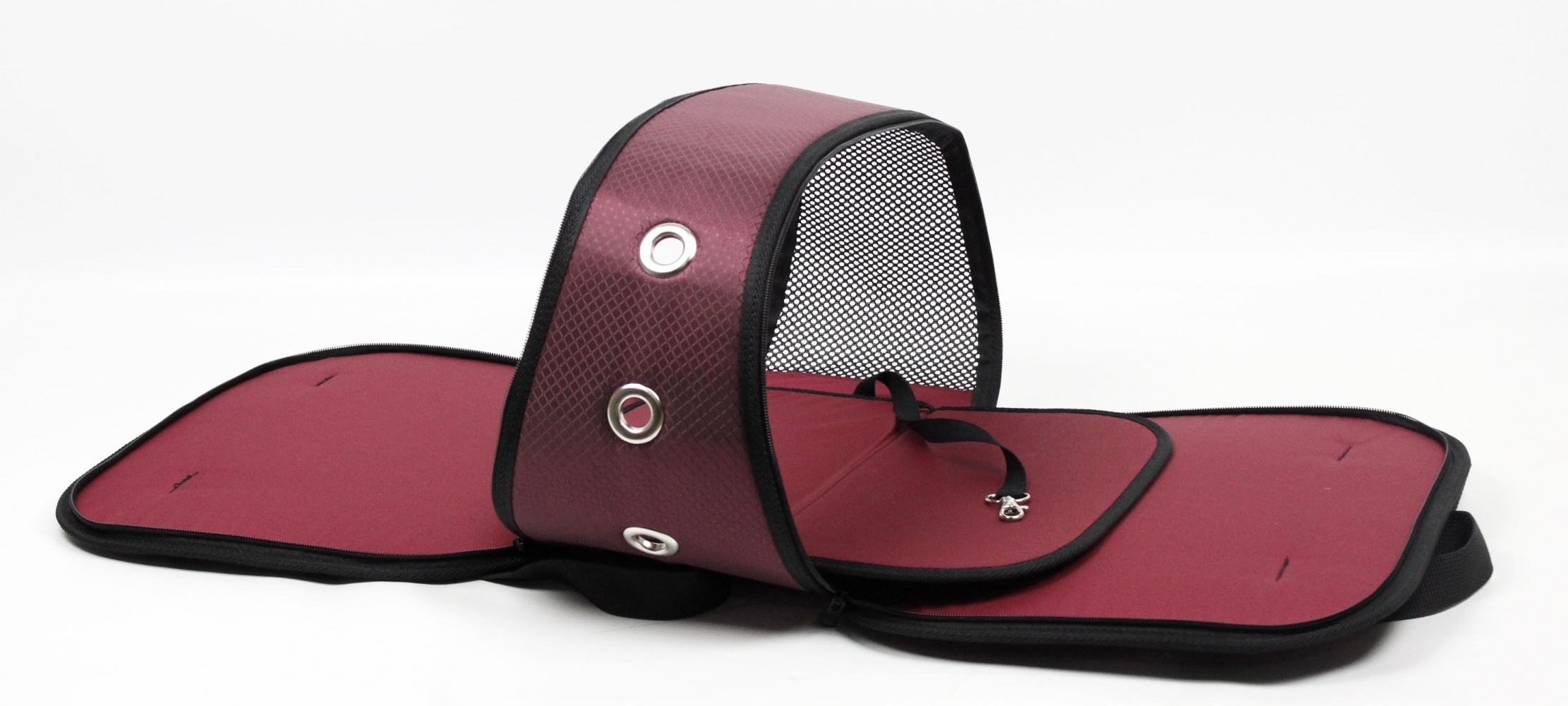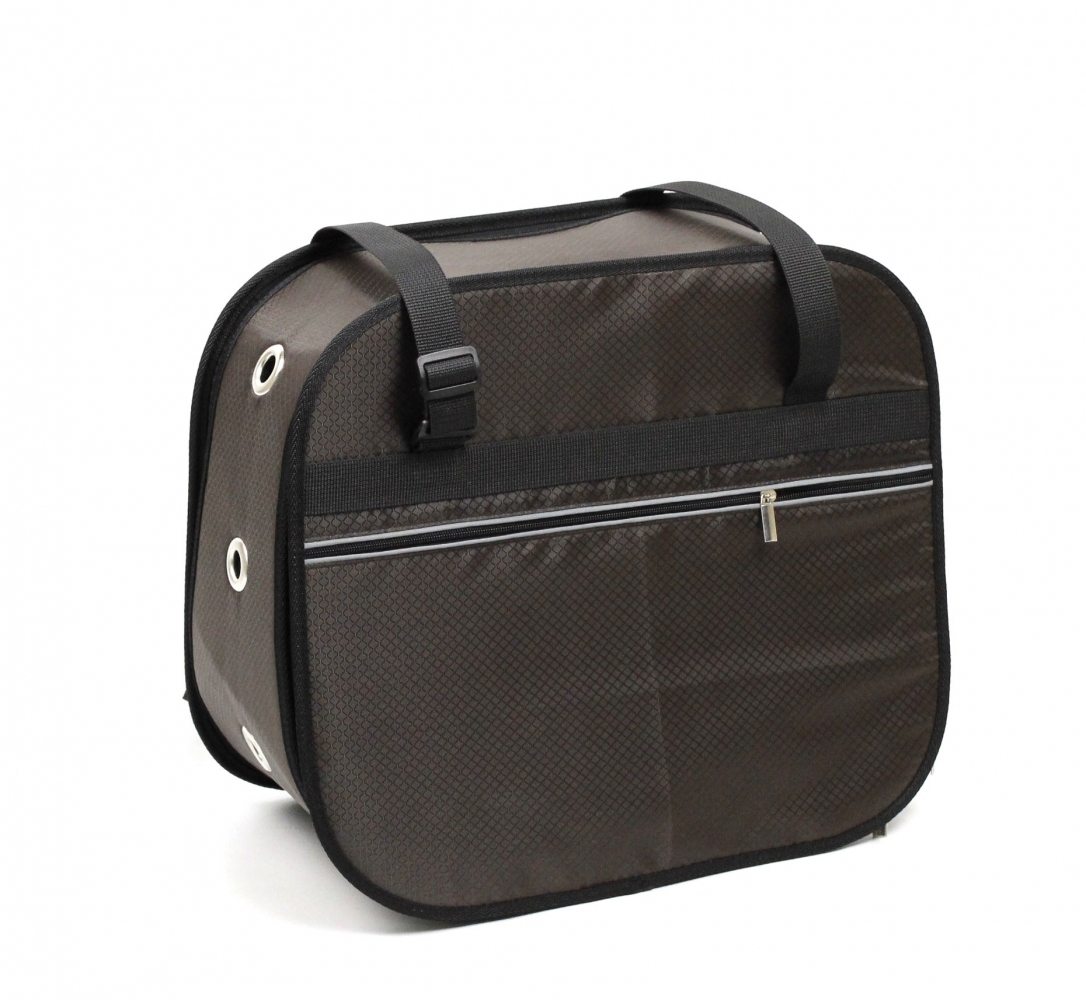 Раскладная дорожная сумка изготовлена из плотной водоотталкивающей плащевки в узор, наполнитель войлок. Карман спереди на молнии, по бокам отверстия для циркуляции воздуха, сбоку есть воздухопроницаемая сетка, поводок с карабином для фиксации за ошейник.