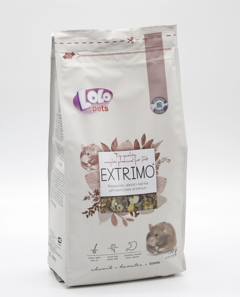 Lolo Pets Extrimo – це екструдований корм для хом'яків. Цей корм поєднує в собі всі найважливіші продукти, які повинні перебувати у щоденному раціоні гризуна. Завдяки цьому хом'як благополучно розвивається та отримує всі важливі вітаміни, мінерали та мікроелементи. Продукти, що знаходяться у складі корму, наповнюють організм тварини йодом, кальцієм, бета-каротином та багатьма іншими не менш важливими елементами. Корм Extrimo доповнений сушеними овочами та фруктами, багатими на натуральні вітаміни та мінерали, завдяки яким охоче споживається тваринами.