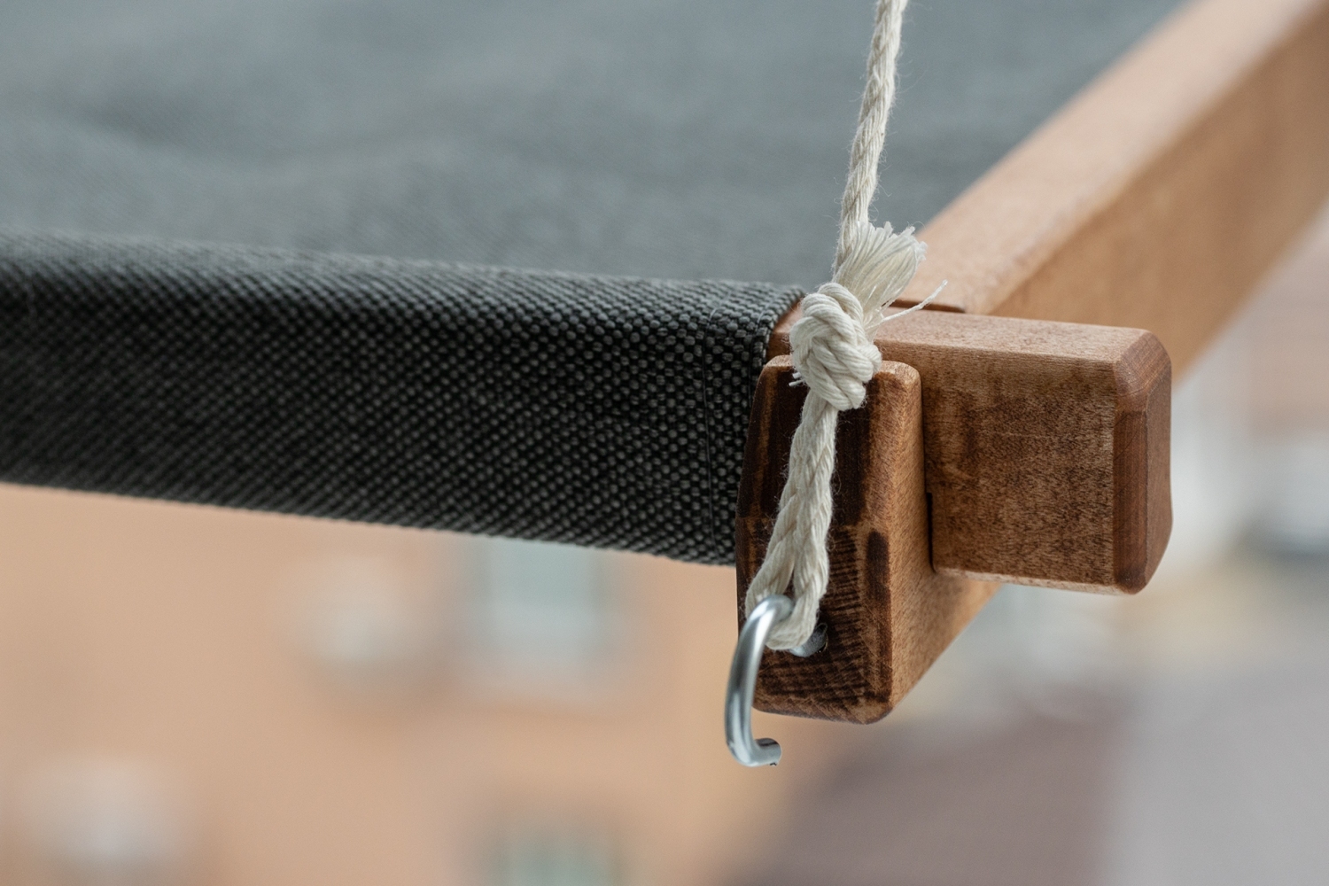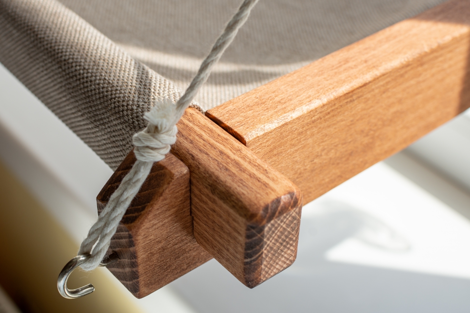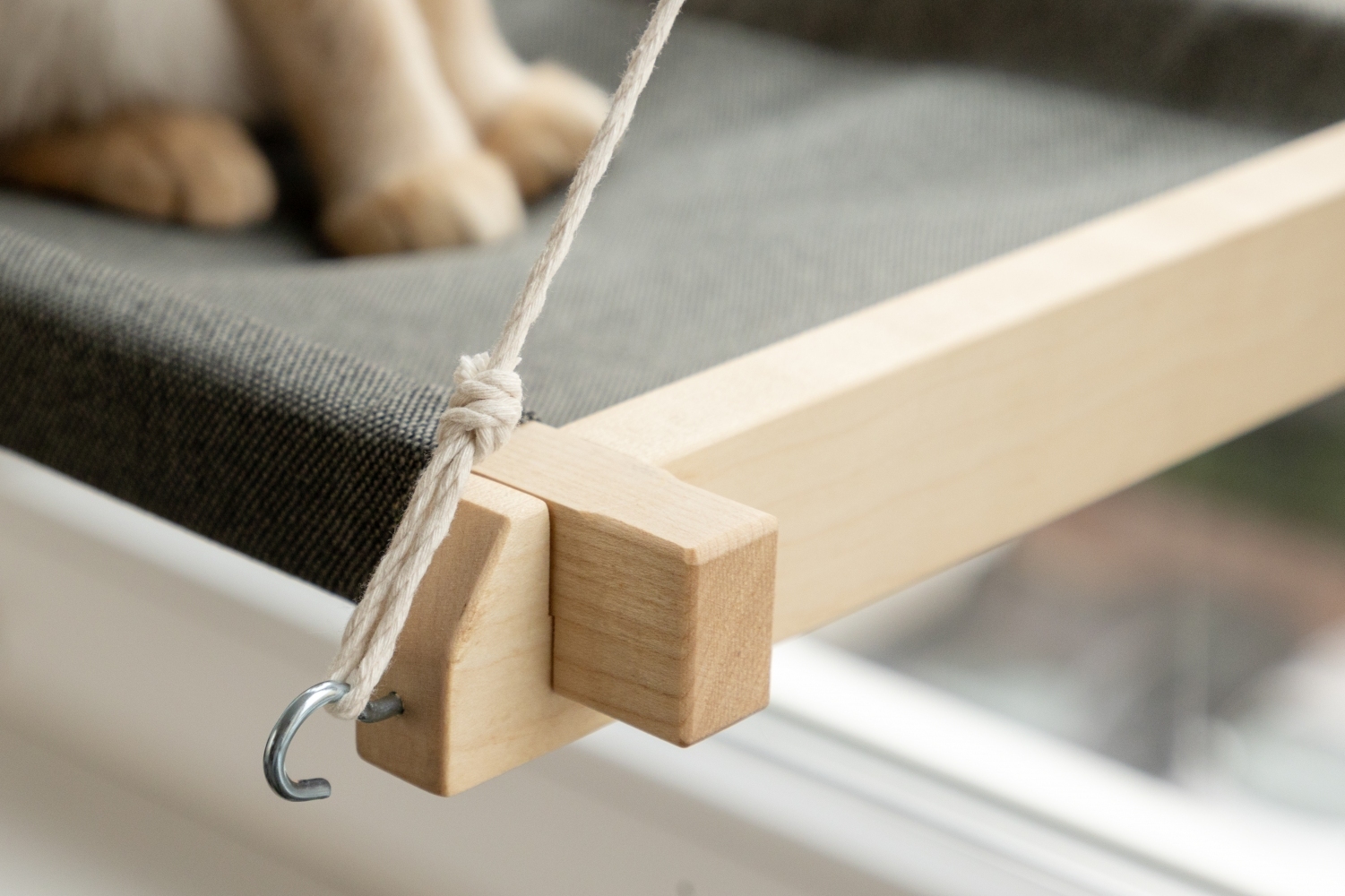 Гамак изготовлен из качественных материалов. Деревянная часть выполнена из клёна, верёвка — из хлопка, а текстильная часть — из прочной ткани рогожки, устойчивой к многократной стирке и кошачьим когтям.